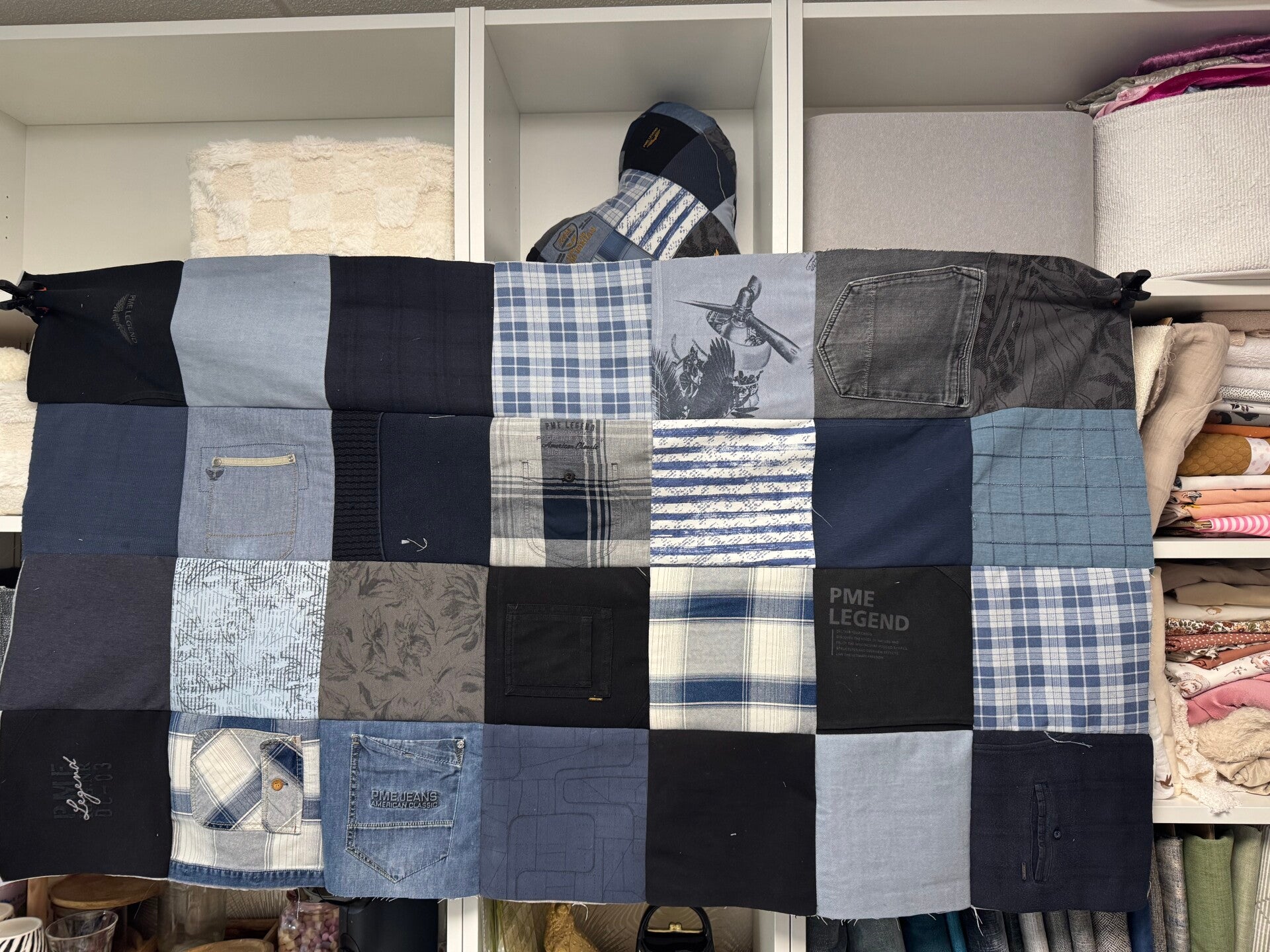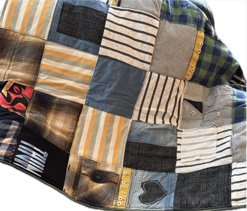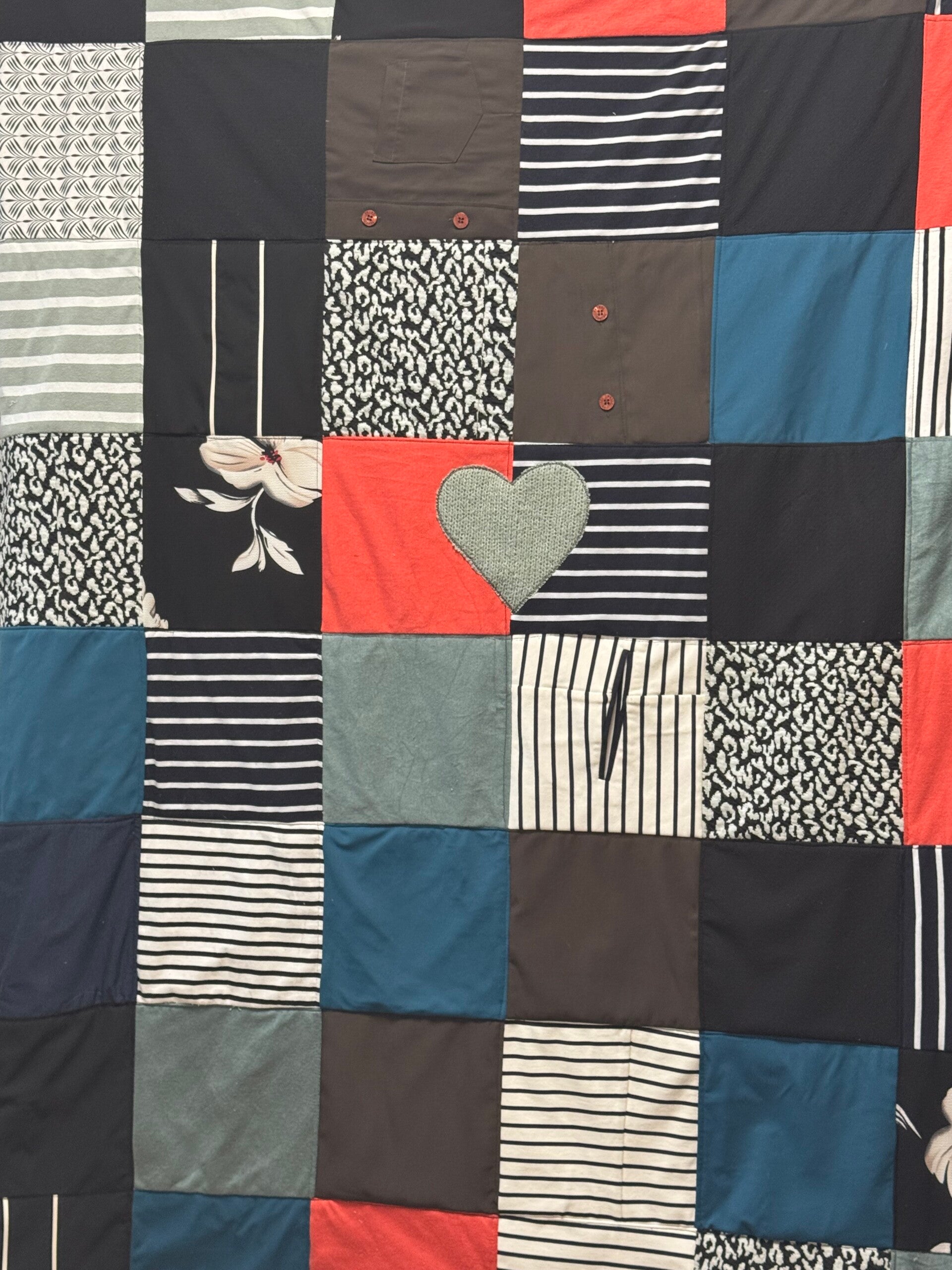 Voor Imke heb ik een herinneringsdeken gemaakt van de blouses van haar vader. Bekende kleuren, printjes en materialen die ooit zo vertrouwd waren.