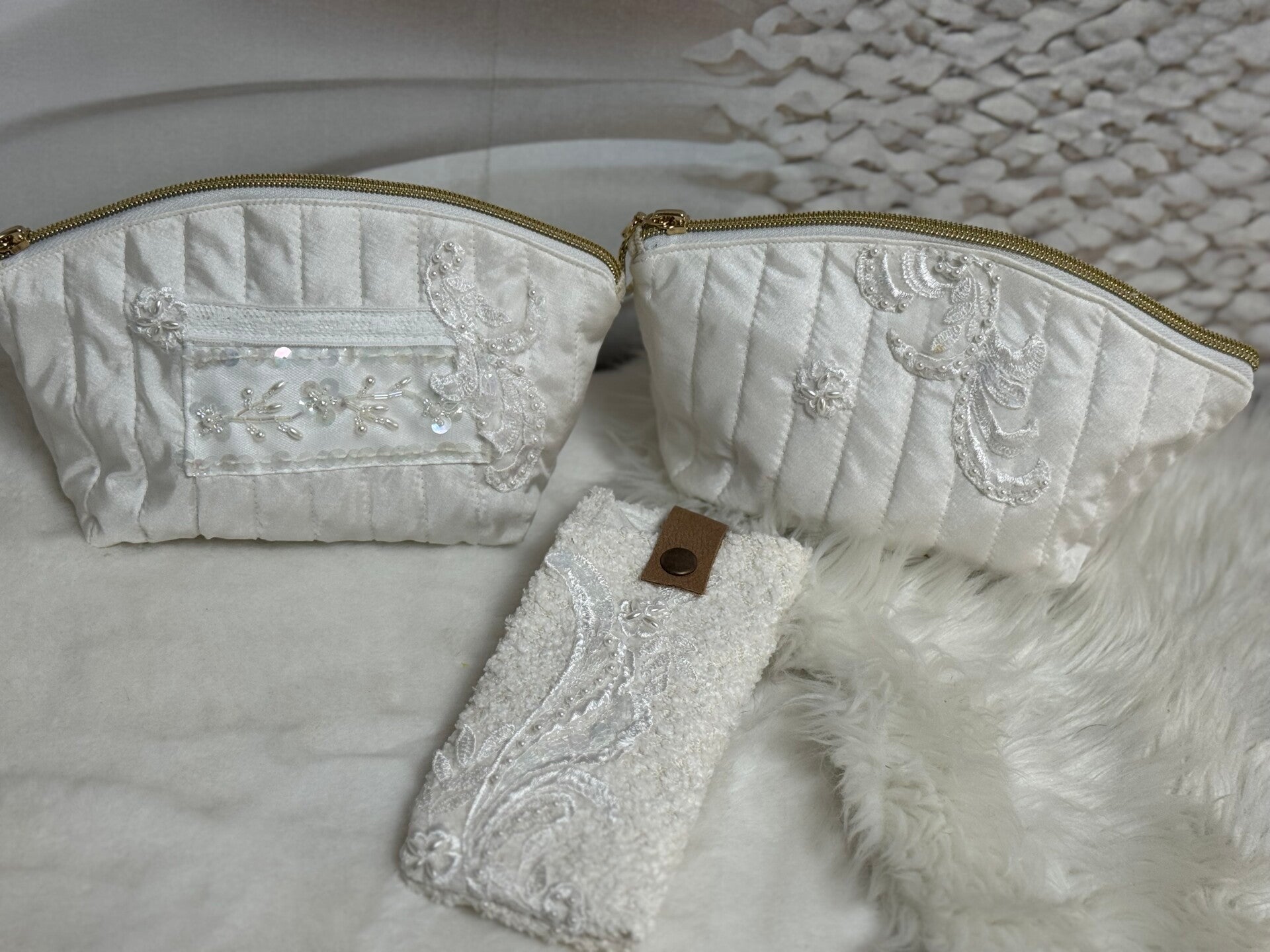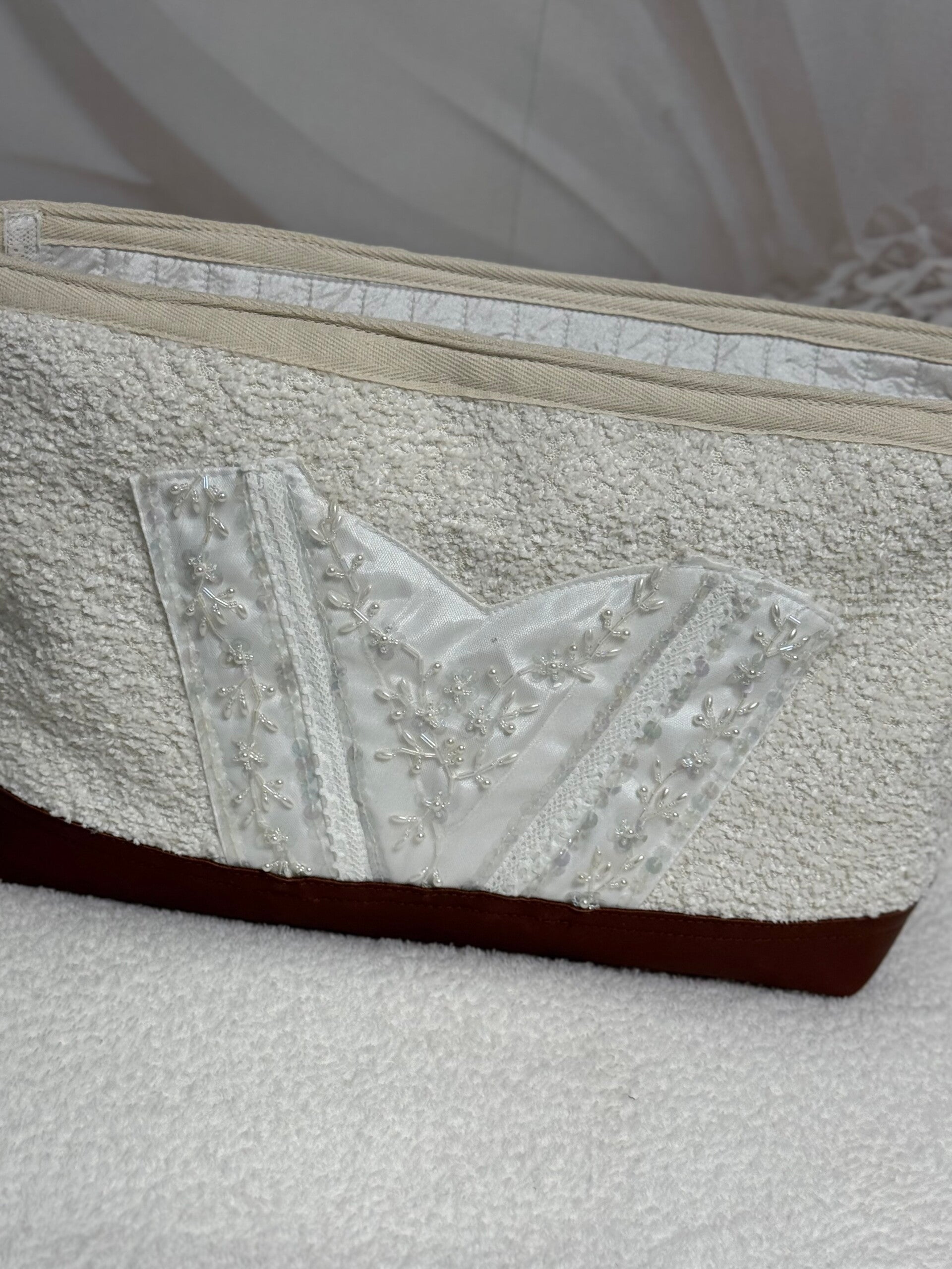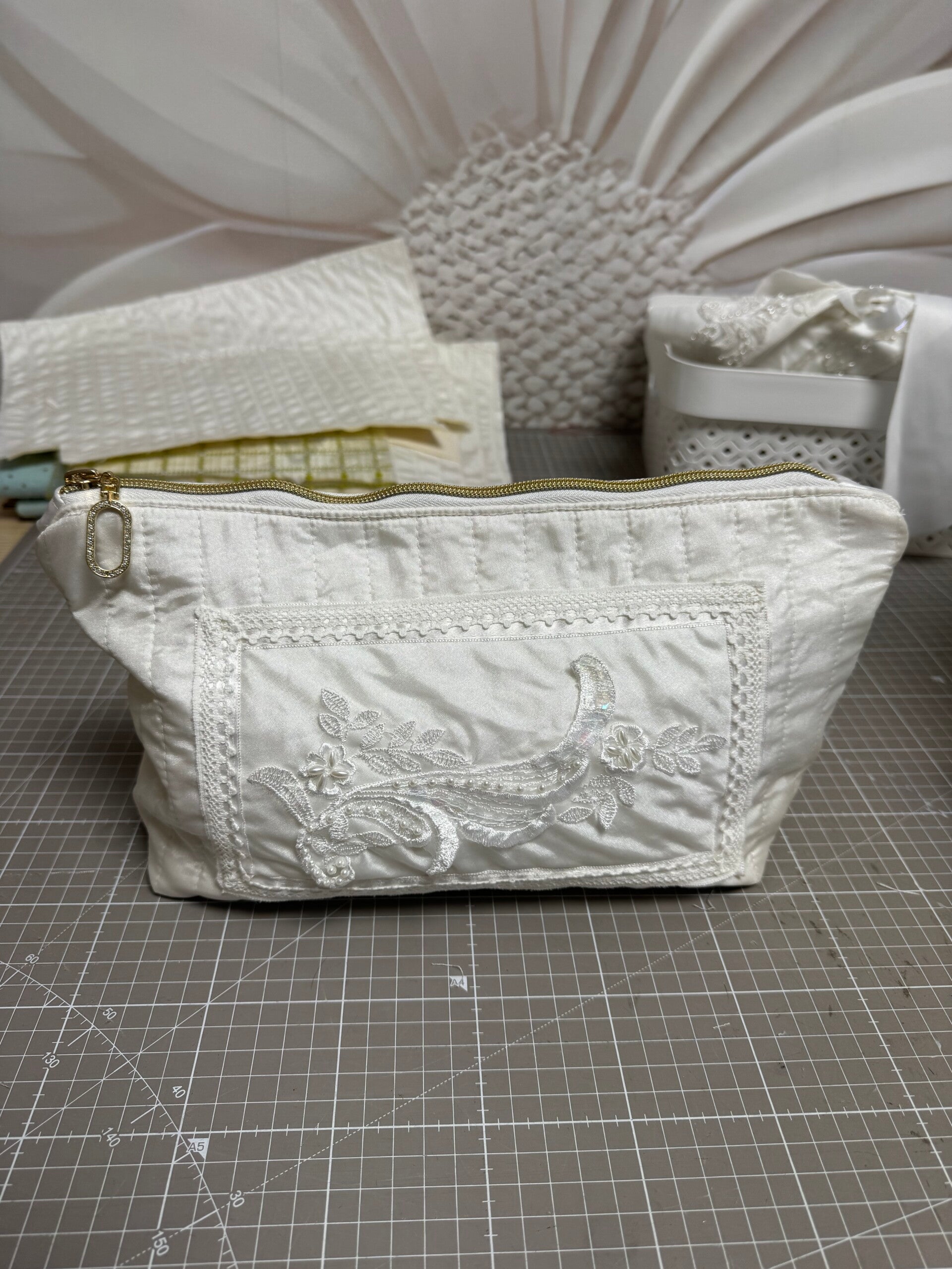 Van haar trouwjurk maakte ik voor haar dochters en kleinkinderen mooie toilettasjes. Voor haarzelf een shopper, met bijpassend toilettasje en brillenhoesje.