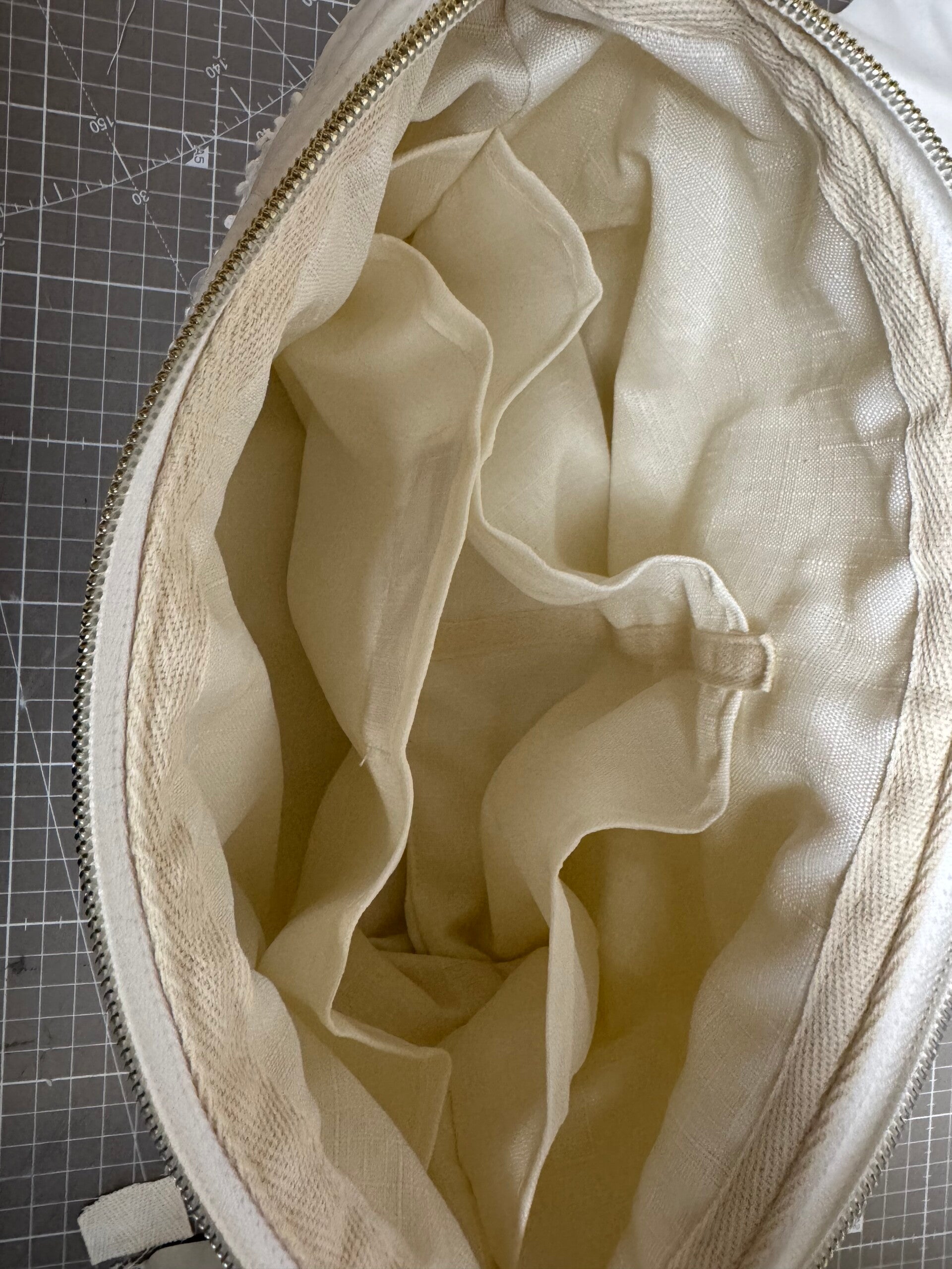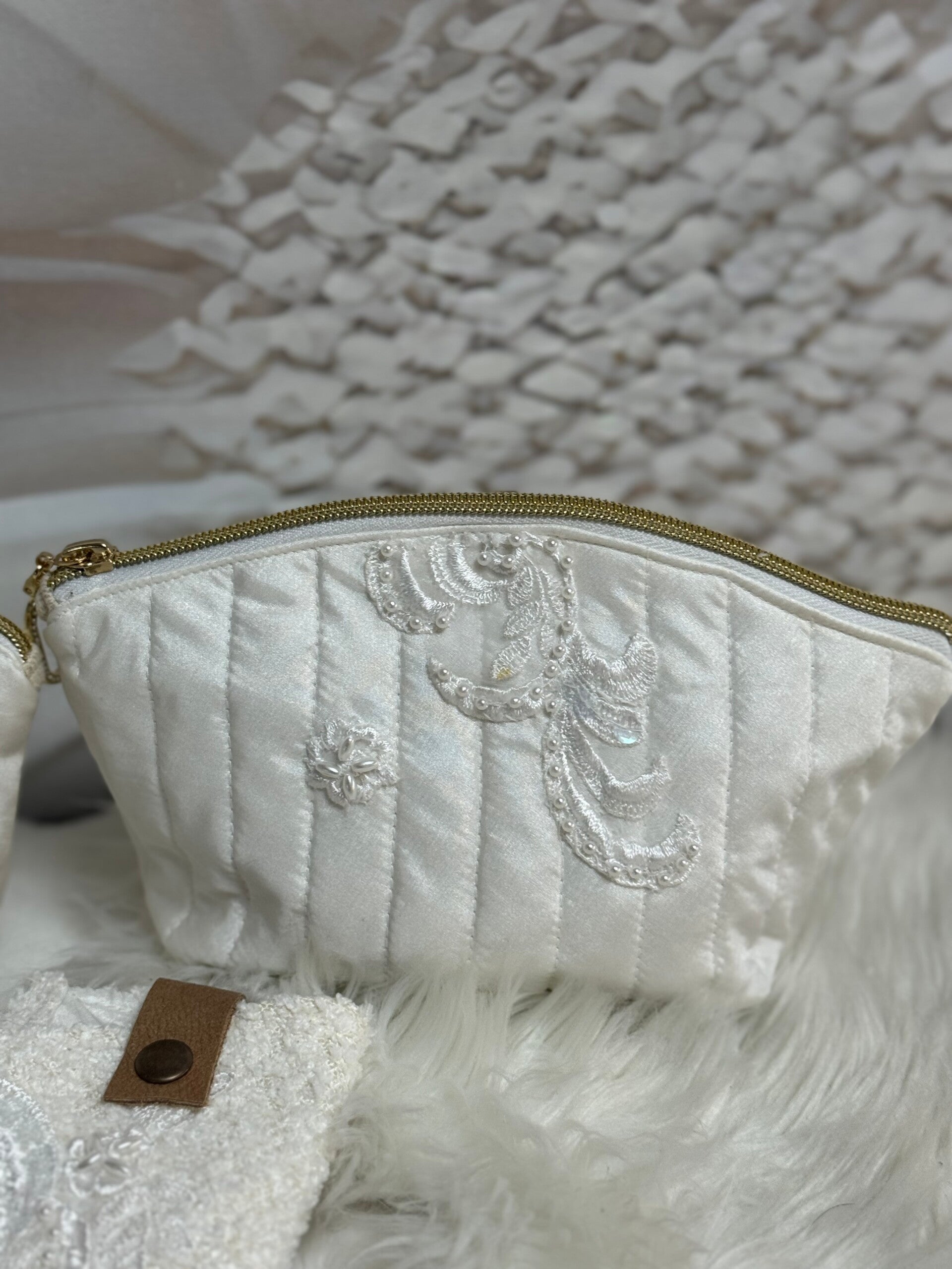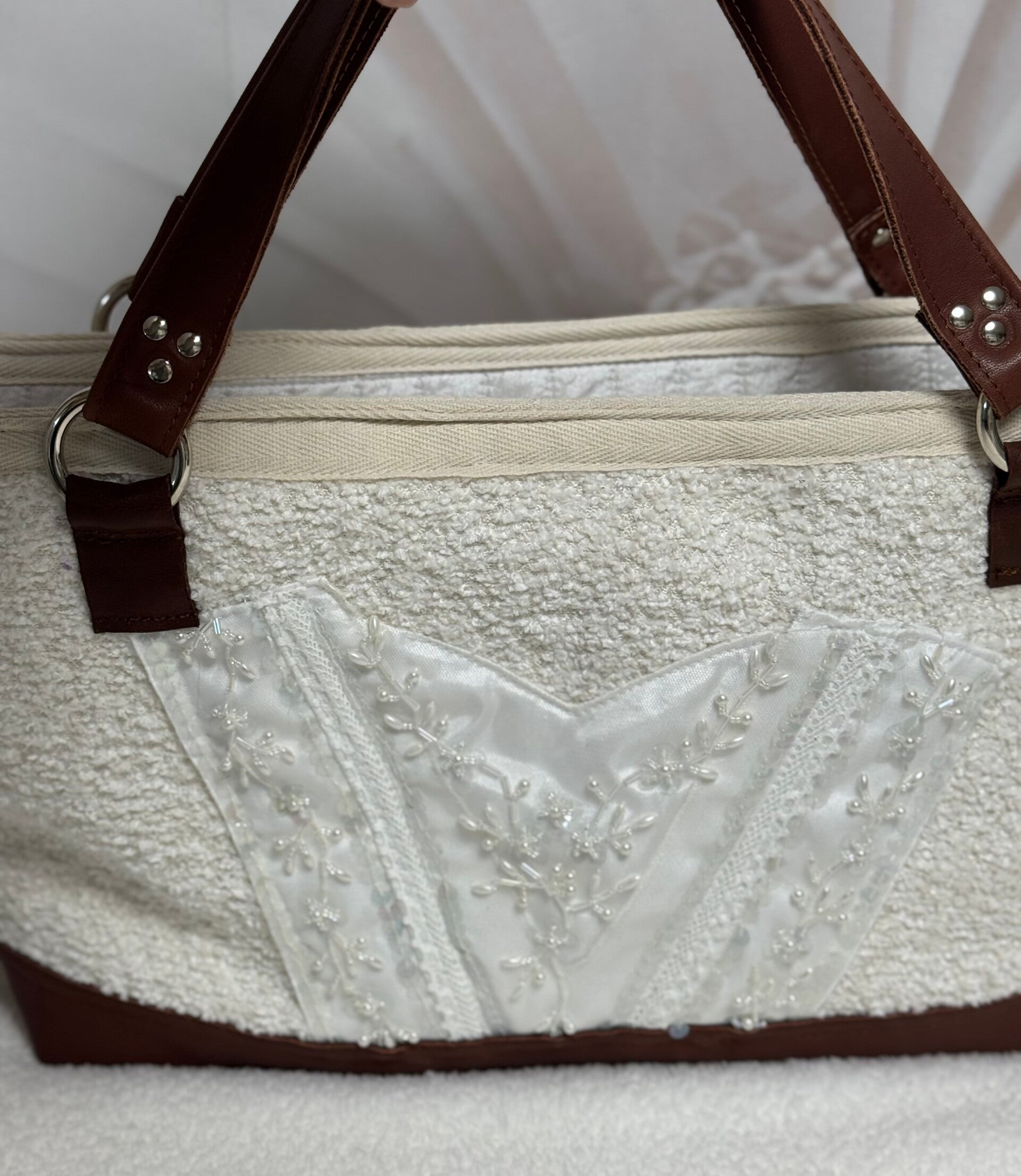 Van haar trouwjurk maakte ik voor haar dochters en kleinkinderen mooie toilettasjes. Voor haarzelf een shopper, met bijpassend toilettasje en brillenhoesje.