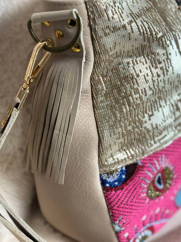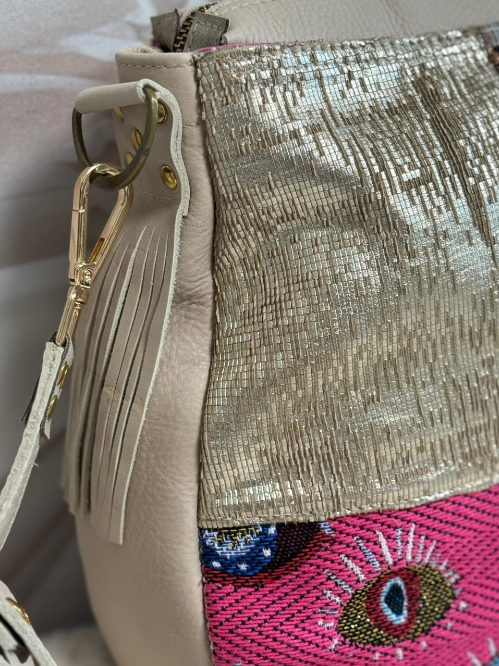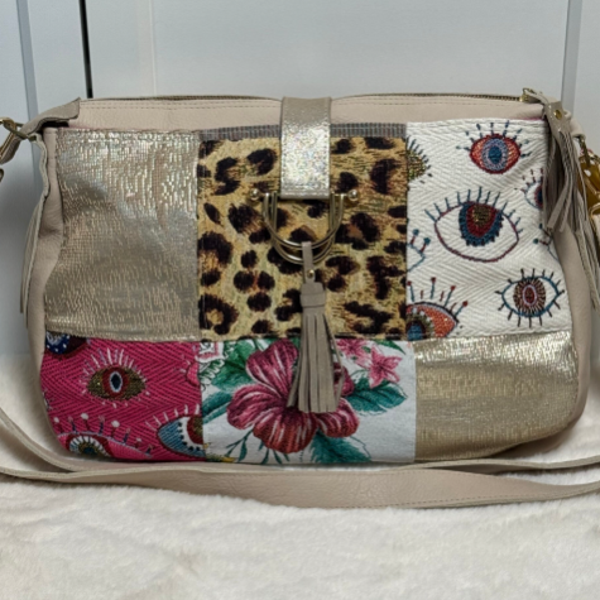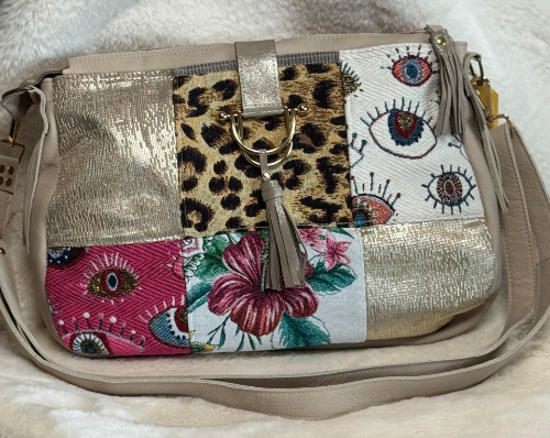 Een opvallende tas in Ibiza-stijl, met een speelse mix van nude-kleurig leer, panterprint, roze binnenvoering en een kleurrijke gobelin met bloemenmotief. Elk detail klopt van de gouden fournituren tot het extra binnenvakje en de stevige schouderband.
