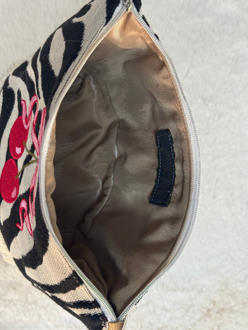 Deze opvallende set bestaat uit een ruime shopper en een bijpassend toilettasje, beide gemaakt van een stevige gobelin-stof met een speels zwart-wit zebtrapatroon. De vrolijke, geborduurde kersen met roze strikje maken het helemaal af.