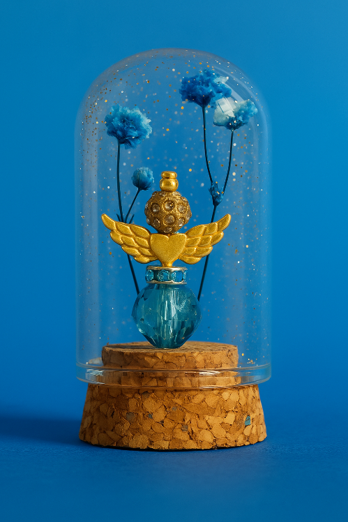 Dit engeltje straalt helderheid en kalmte uit. Met haar kristalblauwe kraal, gouen vleugels en fijne bloemetjes symboliseert ze rust en ruimte.
