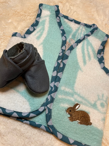Dit lieve baby giletje in maat 86 is gemaakt van een zacht wit-groen vintage dekentje en afgewerkt met een mooi verkleurde bies. Zowel aan de voorkant als op de achterkant is een schattig konijntje geborduurd een vrolijk en speels detail dat dit giletje extra bijzonder maakt.