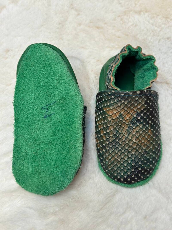 Deze handgemaakte babyslofjes zijn een echte eyecatcher! Uitgevoerd in groen leer met een stoere krokodilprint en voorzien van een soepele suède zool, zodat je kindje grip heeft en comfortabel kan bewegen.