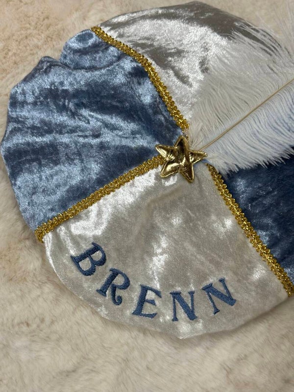Deze pietenmuts is handgemaakt van zachte floers in blauw en crème, afgewerkt met een vrolijke veer en een sierlijke decoratie. Elk exemplaar is uniek met liefde gemaakt, stevig genaaid en helemaal klaar voor het feest.