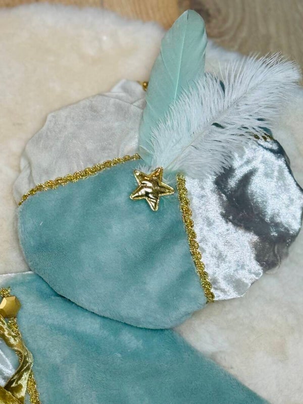 Voor het allermooiste hulppietje een Pieten-set in mintgroen, wit en goud. De set bestaat uit een fluweelzachte cape met gouden strik en glinsterende afwerking, én een bijpassende pietenmuts met sterretje en prachtige veer.
