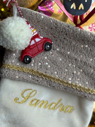 De cremé kleur kerstsok wordt gepersonaliseerd met naam.